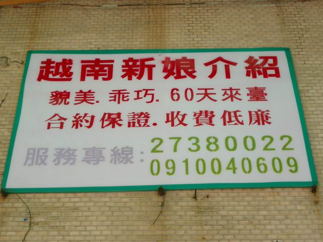 Nu är vi ute på bergsklättring. Skylten säger: "Presenterar er för en vietnamesisk fru. Vacker och snäll, kommer inom 60 dagar. Vi skriver säkra kontrakt och har låga priser." Ny fru, någon?